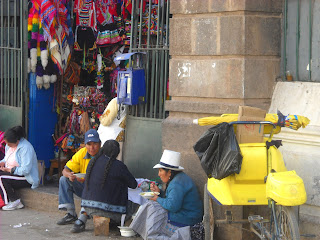 Once in a while I see an unhappy looking tourist wandering through, lost and hoping to buy some trinkets to take home as a keep-sake of being in Cuzco. They mill around gazing at so much gaudy stuff it would make most people nauseous, and they smile at vendors and speak to them like kindergarten teachers interviewed for their first job. You don't want a verbatim dialogue here. They are trying to be nice and to buy something memorable. I have bought stuff in Peru. I bought a sweater, a flag patch of the great nation-state of Georgia, a pair of scissors, an electric plug adaptor, and enough fabric to make a bag to replace the one I have that's ripping out at the bottom. I bought shoe laces and a spare pair of eyeglasses. I've probably bought other stuff that I can't remember. I ain't no purist. I buy lots of stuff, but I have to carry it with me wherever I go, and the less the better. I have a couple of years on the road this time. I can't carry much for that time. I have to get to Africa, after all. So I sit and have coffee and chat up the vendors and wander around a bit and hate the hustle. I go outside the market and chat up people sitting in the sun. I look at things.